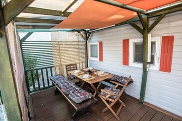 Appartamento può accogliere 4 ospiti. I letti sono disposti nelle camere da letto che sono 2, su 28m2. Gli ospiti hanno a disposizione il proprio terrazzo per godere nelle calde serate estive. Si può preparare il cibo utilizzando il barbecue comune. Durante il soggiorno gli ospiti si possono rilassare nella piscina privata.