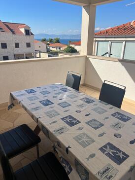 Appartamento può accogliere 6 ospiti. I letti sono disposti nelle camere da letto che sono 3, su 75m2. Gli ospiti hanno a disposizione il proprio terrazzo per godere nelle calde serate estive. Dall'appartamento si gode di una vista sul mare. Si può preparare il cibo utilizzando il barbecue comune.