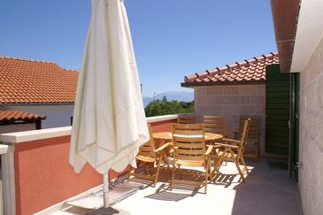 Appartamento può accogliere 5 ospiti. I letti sono disposti nelle camere da letto che sono 2, su 90m2. Gli ospiti hanno a disposizione il proprio terrazzo per godere nelle calde serate estive. Dall'appartamento si gode di una vista sul mare. Si può preparare il cibo utilizzando il barbecue comune.