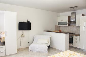 Monolocale può accogliere 2 ospiti. I letti sono disposti nelle camere da letto che sono 1, su 26m2. Gli ospiti hanno a disposizione il proprio terrazzo per godere nelle calde serate estive. Dal monolocale si gode di una vista sul mare. Si può preparare il cibo utilizzando il barbecue comune.