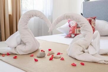 Casa può accogliere 6 ospiti. I letti sono disposti nelle camere da letto che sono 3, su 75m2. Gli ospiti hanno a disposizione il proprio terrazzo per godere nelle calde serate estive. Dalla casa si gode di una vista sul mare. Si può preparare il cibo utilizzando il barbecue comune. Nell'unità di alloggio si possono portare gli animali domestici senza alcun pagamento supplementare. Le stanze dell'unità d'alloggio non sono connesse in un insieme.
