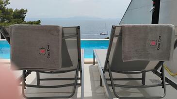 Casa può accogliere 8 ospiti. I letti sono disposti nelle camere da letto che sono 3, e nella camera di soggiorno, su 74m2. Gli ospiti hanno a disposizione il proprio terrazzo per godere nelle calde serate estive. Dalla casa si gode di una vista sul mare. Per il piacere totale e il relax c'è il barbecue privato solo per gli ospiti di quest'alloggio. Durante il soggiorno gli ospiti si possono rilassare nella piscina privata.