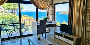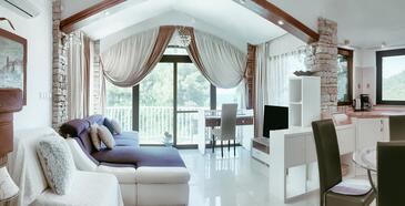 Appartamento può accogliere 4 ospiti. I letti sono disposti nelle camere da letto che sono 2, su 70m2. Gli ospiti hanno a disposizione il proprio terrazzo per godere nelle calde serate estive. Dall'appartamento si gode di una vista sul mare. Per il piacere totale e il relax c'è il barbecue privato solo per gli ospiti di quest'alloggio. Durante il soggiorno gli ospiti possono utilizzare la piscina comune. Le stanze dell'unità d'alloggio non sono connesse in un insieme.