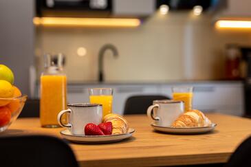 Appartamento può accogliere 6 ospiti. I letti sono disposti nelle camere da letto che sono 3, su 76m2. Gli ospiti hanno a disposizione il proprio balcone per godere delle calde serate estive. Si può preparare il cibo utilizzando il barbecue comune.