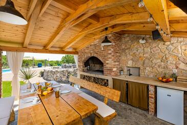 Casa può accogliere 10 ospiti. I letti sono disposti nelle camere da letto che sono 3, e nella camera di soggiorno, su 116m2. Gli ospiti hanno a disposizione il proprio terrazzo per godere nelle calde serate estive. Per il piacere totale e il relax c'è il barbecue privato solo per gli ospiti di quest'alloggio. Durante il soggiorno gli ospiti si possono rilassare nella piscina privata. Nell'unità di alloggio si possono portare gli animali domestici con un pagamento supplementare. Le stanze dell'unità d'alloggio non sono connesse in un insieme. L'unità d'alloggio ha delle stanze separate dal resto dell'unità. Arrivati nell'unità d'alloggio i clienti devono pagare un deposito (il prezzo è indicato sul sito).