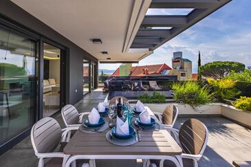 Appartamento può accogliere 8 ospiti. I letti sono disposti nelle camere da letto che sono 3, e nella camera di soggiorno, su 83m2. Gli ospiti hanno a disposizione il proprio terrazzo per godere nelle calde serate estive. Dall'appartamento si gode di una vista sul mare. Nell'unità di alloggio si possono portare gli animali domestici con un pagamento supplementare.