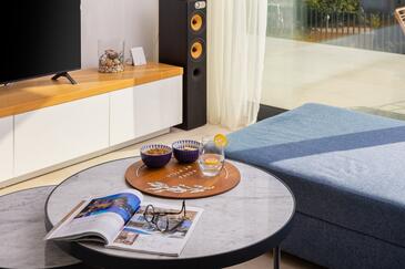 Casa può accogliere 8 ospiti. I letti sono disposti nelle camere da letto che sono 3, e nella camera di soggiorno, su 122m2. Gli ospiti hanno a disposizione il proprio terrazzo per godere nelle calde serate estive. Dalla casa si gode di una vista sul mare. Per il piacere totale e il relax c'è il barbecue privato solo per gli ospiti di quest'alloggio. Durante il soggiorno gli ospiti si possono rilassare nella piscina privata. Nell'unità di alloggio si possono portare gli animali domestici senza alcun pagamento supplementare. Arrivati nell'unità d'alloggio i clienti devono pagare un deposito (il prezzo è indicato sul sito).