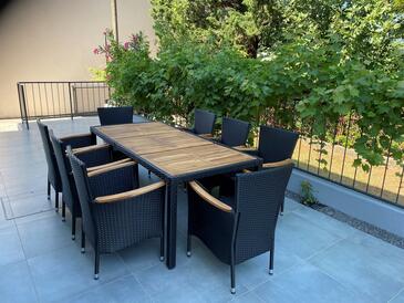 Appartamento può accogliere 6 ospiti. I letti sono disposti nelle camere da letto che sono 3, su 64m2. Gli ospiti hanno a disposizione il proprio terrazzo per godere nelle calde serate estive. Si può preparare il cibo utilizzando il barbecue comune.
