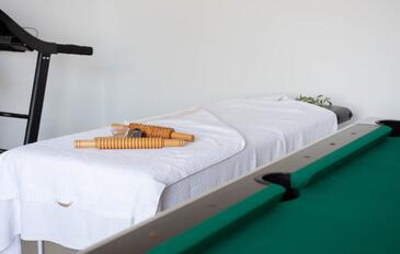 Appartamento può accogliere 8 ospiti. I letti sono disposti nelle camere da letto che sono 3, su 116m2. Gli ospiti hanno a disposizione il proprio terrazzo per godere nelle calde serate estive. Dall'appartamento si gode di una vista sul mare. Per il piacere totale e il relax c'è il barbecue privato solo per gli ospiti di quest'alloggio. Durante il soggiorno gli ospiti possono utilizzare la piscina comune.