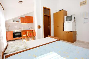Appartamento può accogliere 5 ospiti. I letti sono disposti nelle camere da letto che sono 2, e nella sala da pranzo, su 43m2. Gli ospiti hanno a disposizione il proprio terrazzo per godere nelle calde serate estive. Dall'appartamento si gode di una vista sul mare. Si può preparare il cibo utilizzando il barbecue comune.