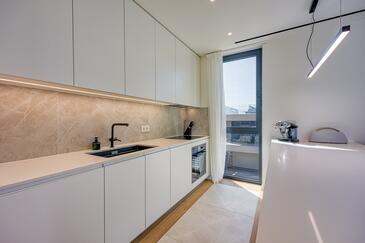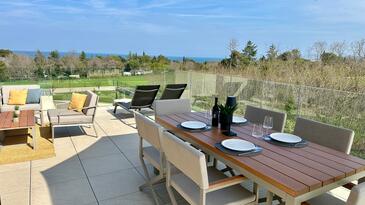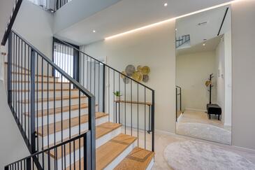 Casa può accogliere 8 ospiti. I letti sono disposti nelle camere da letto che sono 3, e nella camera di soggiorno, su 186m2. Gli ospiti hanno a disposizione il proprio terrazzo per godere nelle calde serate estive. Dalla casa si gode di una vista sul mare. Durante il soggiorno gli ospiti possono utilizzare la piscina comune.