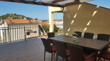 Appartamento può accogliere 6 ospiti. I letti sono disposti nelle camere da letto che sono 3, su 72m2. Gli ospiti hanno a disposizione il proprio terrazzo per godere nelle calde serate estive. Dall'appartamento si gode di una vista sul mare. Si può preparare il cibo utilizzando il barbecue comune.